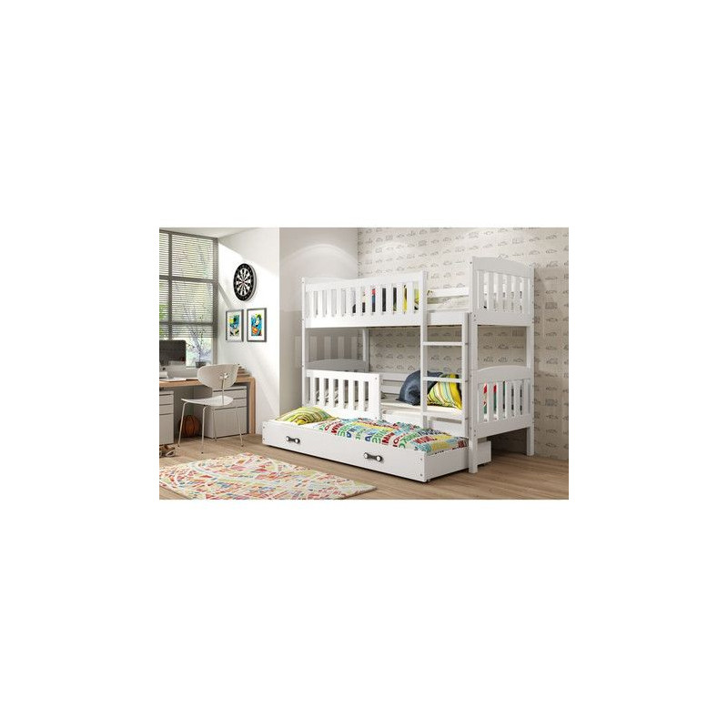 Dětská patrová postel Kubus s výsuvnou postelí včetně matrací a roštů. Postel obsahuje ochrannou zábranu. S ohledem na děti je veškerý sortiment vyroben ekologicky. Je tedy vyloučeno při kontaktu dítěte s nábytkem požití toxických nebo zdraví škodlivých látek. Žebřík lze namontovat vpravo i vlevo. - Moderní postel vyrobená z masivu borovice. - 100% ochrana pro vaše dítě díky bezpečnostní zábraně. - Rošty vyrobené ze dřeva, z pružinových lamel, které jsou upevněné PVC madlem na kovové liště. - Pěnové matrace, které jsou vysoce hypoalergenní s lehce snímatelným potahem, potah lze prát v pračce. Matrace je univerzální, vzdušná a velmi dobře odvádí vlhkost. Výška matrace je 7 cm. Údržba: Povrch nábytku utřete do čista měkkým hadříkem. Vyhněte se použití chemikálií.