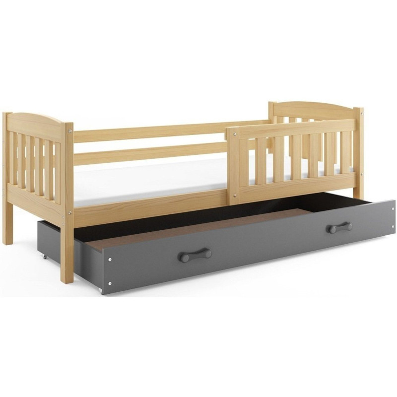 Dětská postel Kubus s úložným prostorem včetně matrace a roštu. Postel obsahuje ochrannou zábranu. S ohledem na děti je veškerý sortiment vyroben ekologicky. Je tedy vyloučeno při kontaktu dítěte s nábytkem požití toxických nebo zdraví škodlivých látek. - Moderní postel vyrobená z masivu borovice. - 100% ochrana pro vaše dítě díky bezpečnostní zábraně. - Rošt vyrobený ze dřeva, z pružinových lamel, které jsou upevněné PVC madlem na kovové liště. - Pěnová matrace, která je vysoce hypoalergenní s lehce snímatelným potahem, potah lze prát v pračce. Matrace je univerzální, vzdušná a velmi dobře odvádí vlhkost. Výška matrace je 7 cm. Údržba: Doporučujeme čistit pouze jemnou houbičkou. Nebělte, mohlo by dojít k poškození vláken.