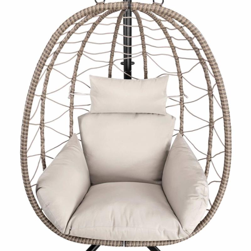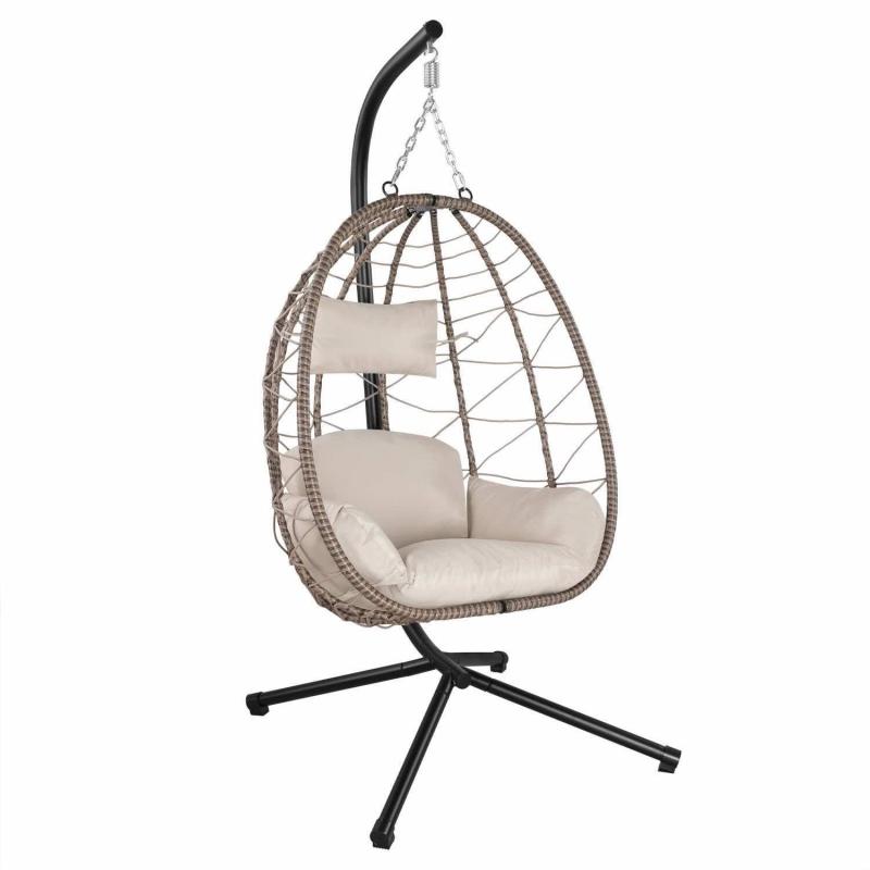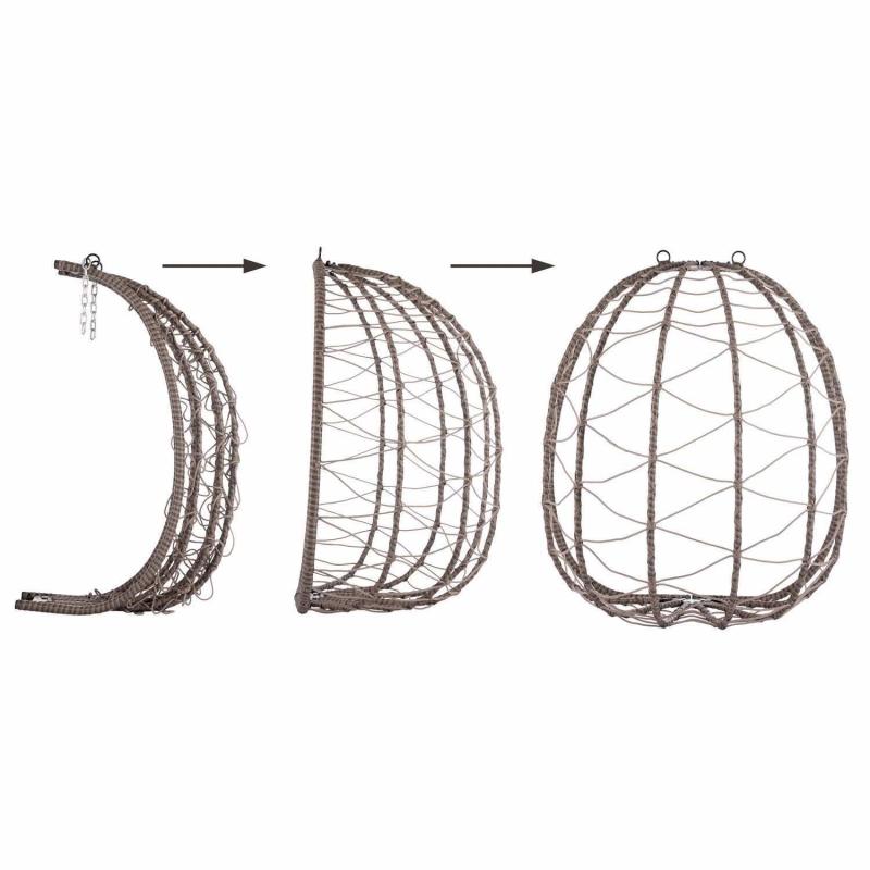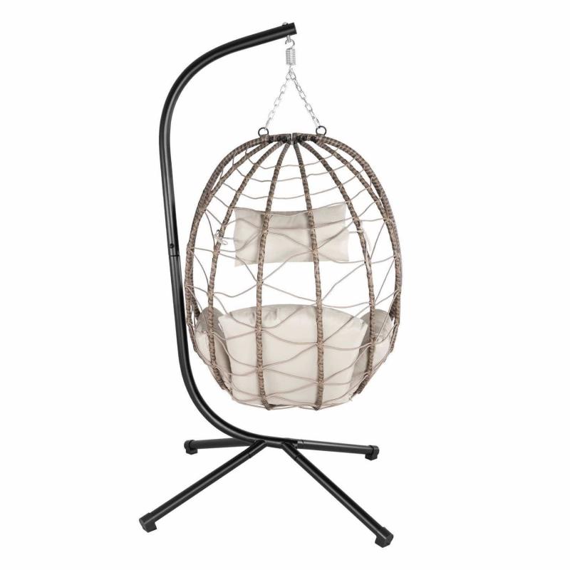 Moderní proutěné závěsné křeslo Aria v béžové barvě slouží k pohodovému čtení, sledování televize nebo relaxu. Ergonomicky tvarované křeslo se dokonale přizpůsobí vašemu tělu. Pohodlně se houpejte ve velkém závěsném sedadle s měkkým polstrováním. Stojící závěsné křeslo s odpružením a železným rámem unese až 130 kg a je výškově nastavitelné. Cca 5 cm silný železný rám ve tvaru C se stojanem ve tvaru X zajišťuje stabilitu křesla. Práškové lakování stabilních trubek chrání před nevzhlednými škrábanci, rovněž 4 pogumované nožičky chrání podlahu. Velkou výhodou je koš, který lze vertikálně složit. To vám umožní odložit jej, abyste ušetřili místo, když se nepoužívá.