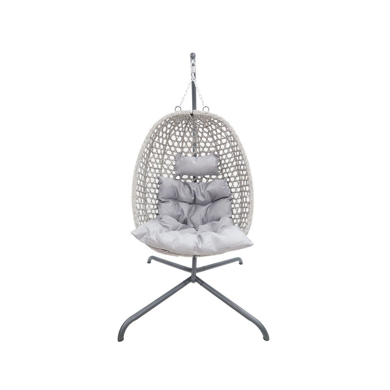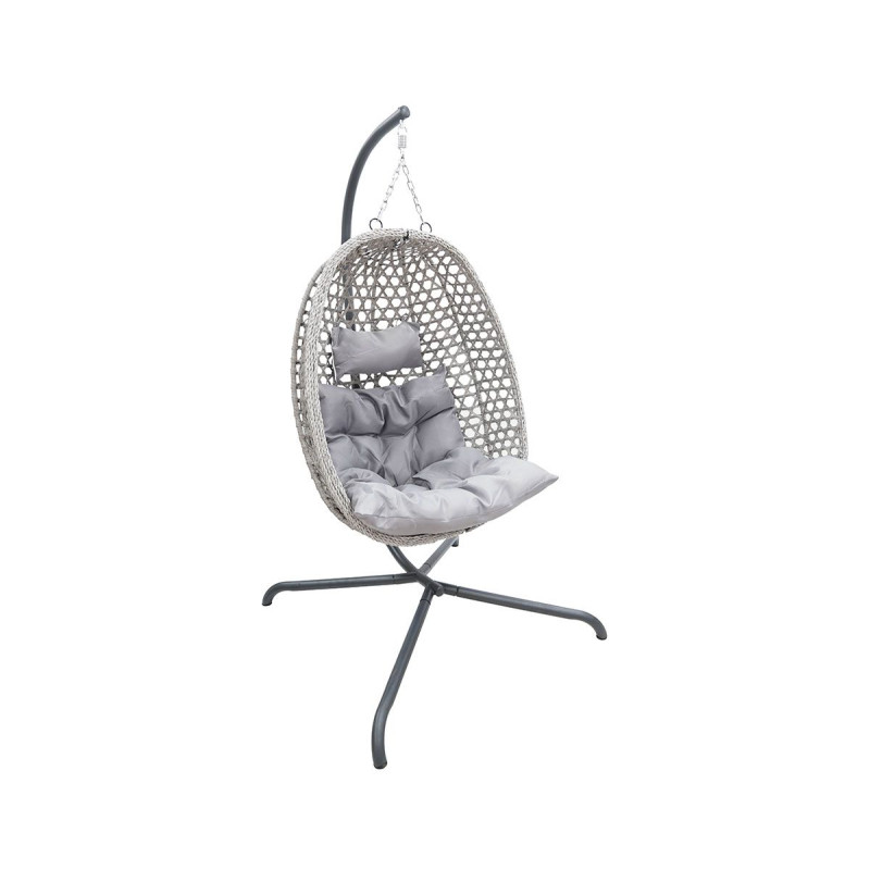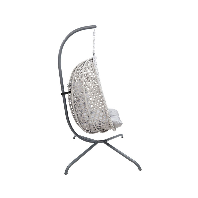MateriálUmělý PE ratan: Šedá100% polyester: ŠedáOcel: ČernáRozměry křeslaŠířka: 93 cmHloubka: 65 cmVýška: 110 cmRozměry stojanuŠířka: 103 cmHloubka: 103 cmVýška: 195 cmMaximální zatížení stojanu s křeslem: 100 kgProveden...