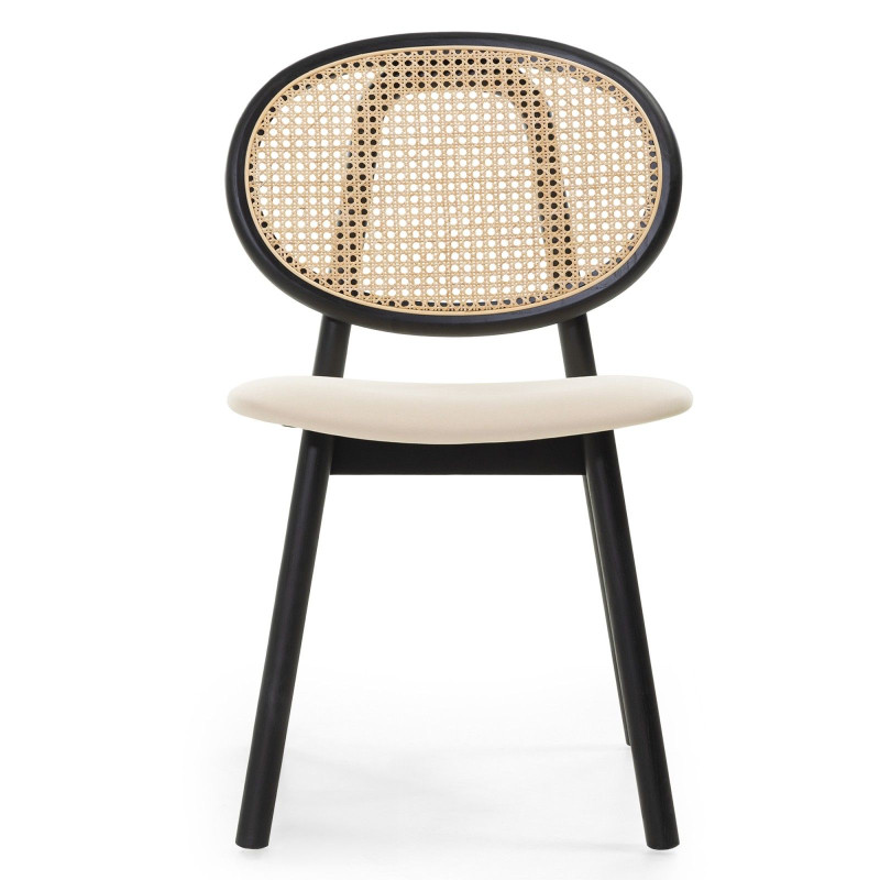 Její měkký sedák je čalouněný hebkou velurovou látkou ve světlém béžovém odstínu a působivě tak kontrastuje s konstrukcí, která je vyrobená z jasanového dřeva v černé barvě.
